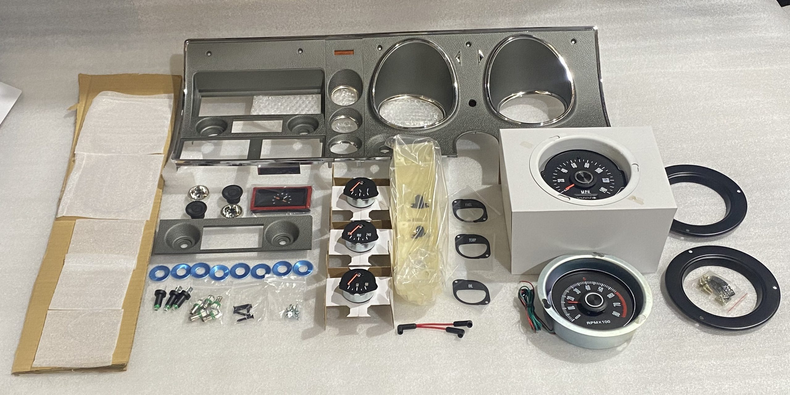 COMES WITH: FACIA LENSES REV TACHO 140MPH SPEEDO RADIO FACIA & KNOBS FAKE CLOCK FACE TEMP,FUEL .OIL GAUGES WITH FACE PLATES DASH KNOB INSERTS LED GREEN GLOBES WITH 3 SOCKETS SCREWS POD GAUGE WIRE CONNECTOR GAUGE RETAINER KIT |